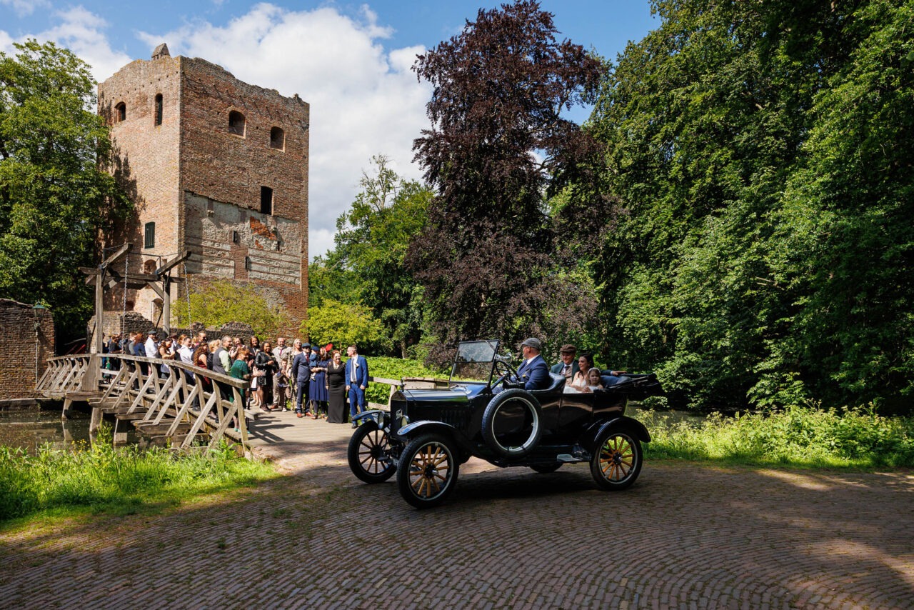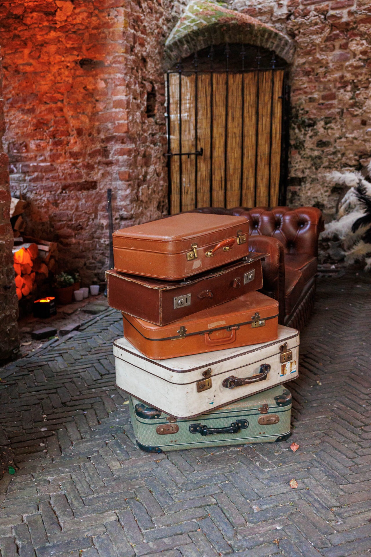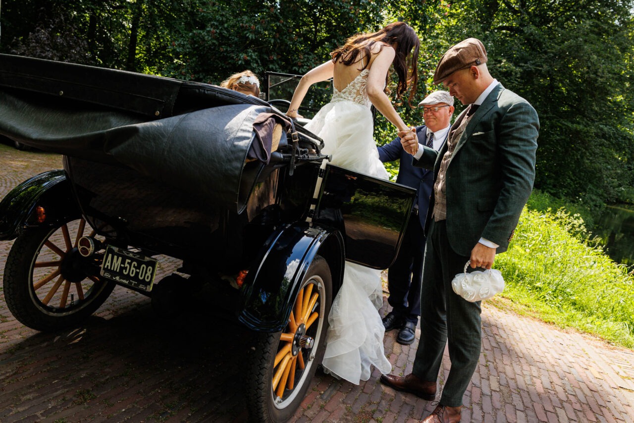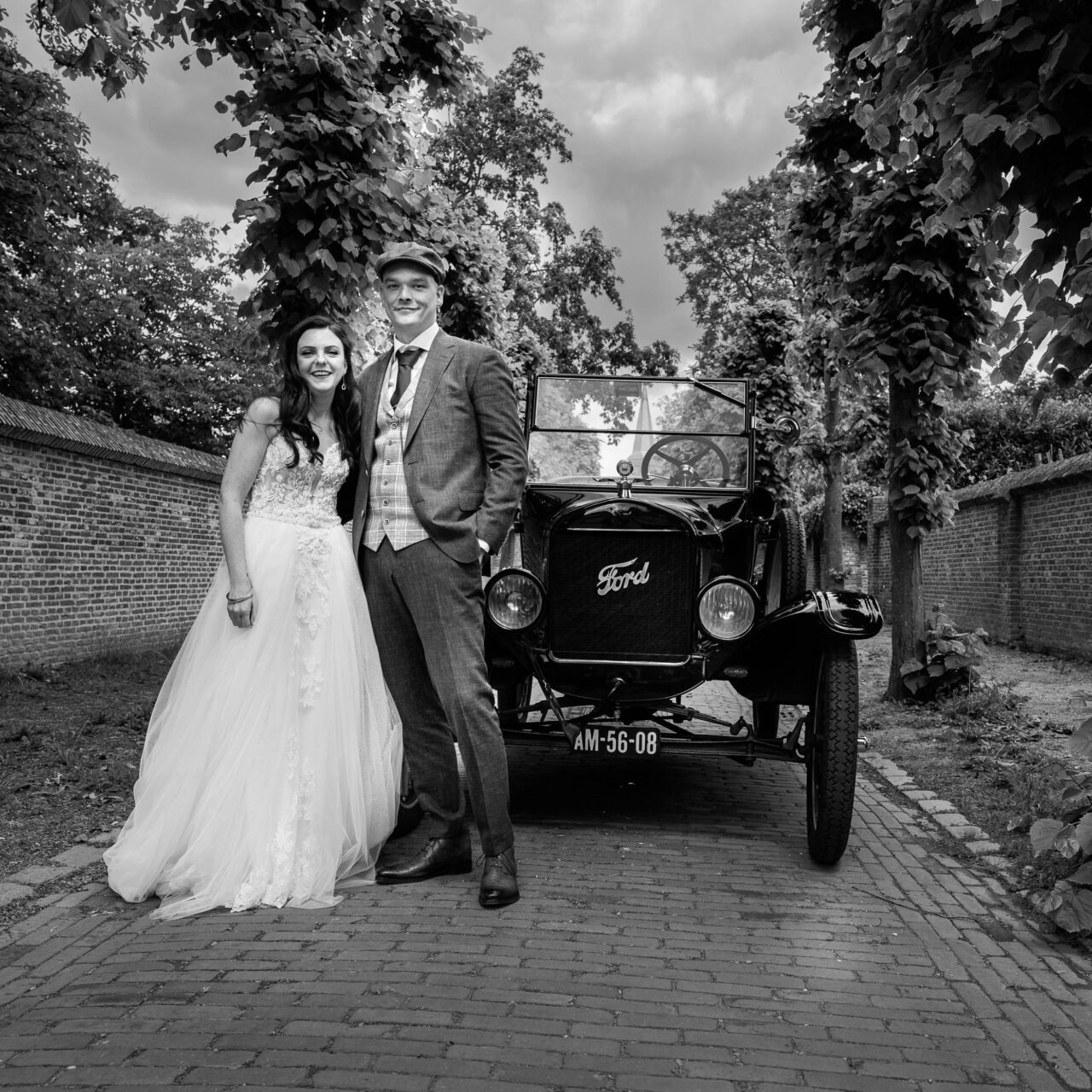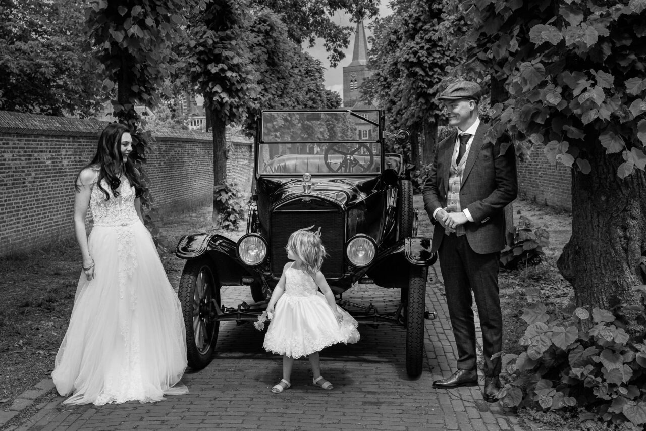 De sfeer was duidelijk geïnspireerd op Peaky Blinders, maar dan op hun eigen manier: liefdevol, warm, stijlvol en met oog voor detail. Veel vintage koffers, een oude fotocamera en 4 chesterfield banken gaven het geheel karakter, terwijl buiten die prachtige jaren ’20 auto stond te wachten. Voor mij als bruidsfotograaf heel bijzonder om erbij te mogen zijn.