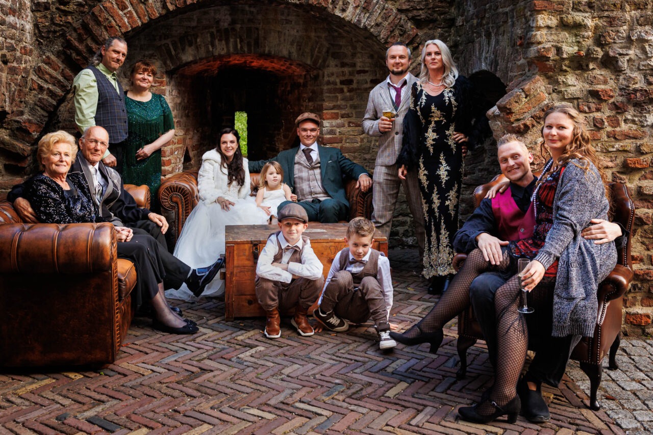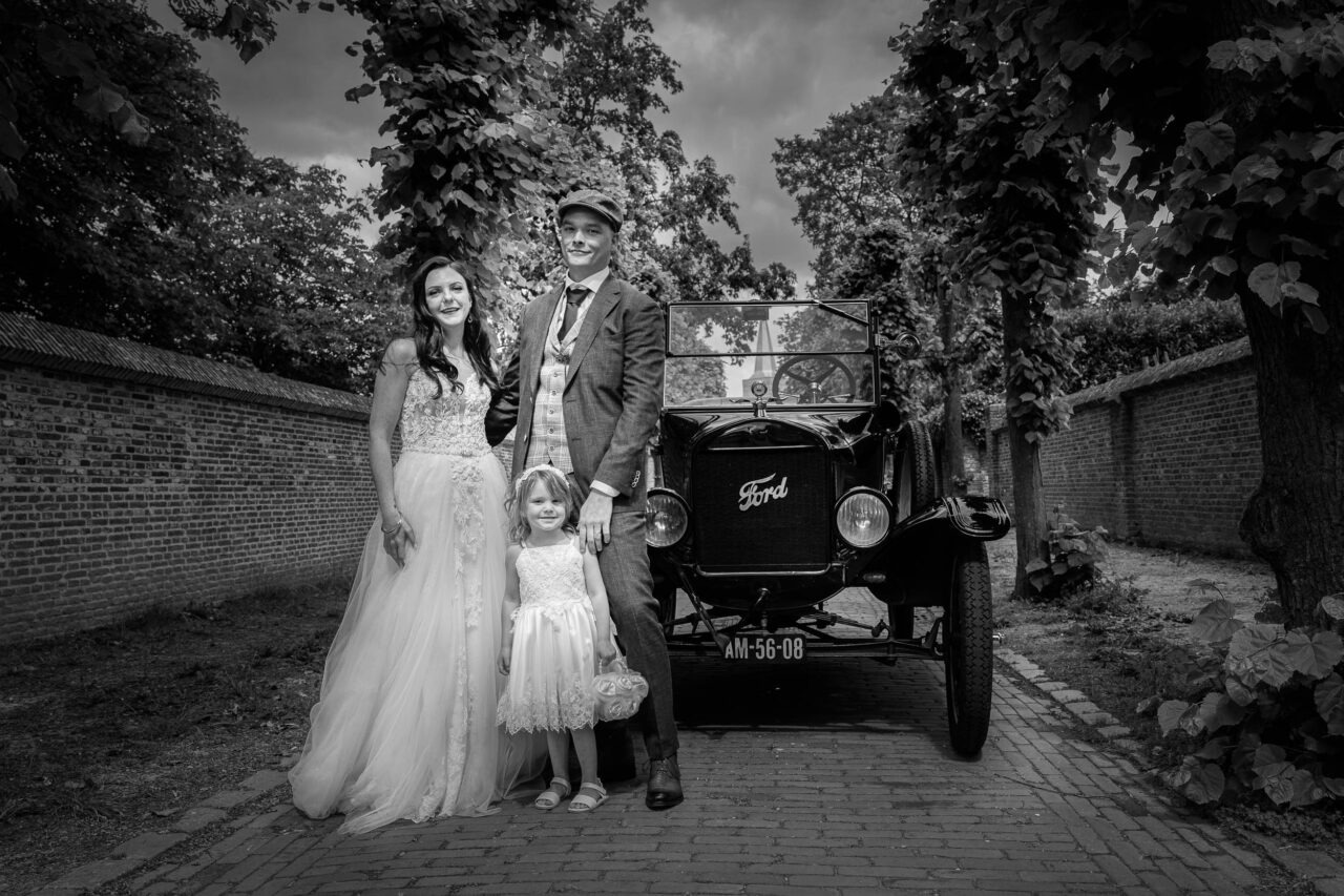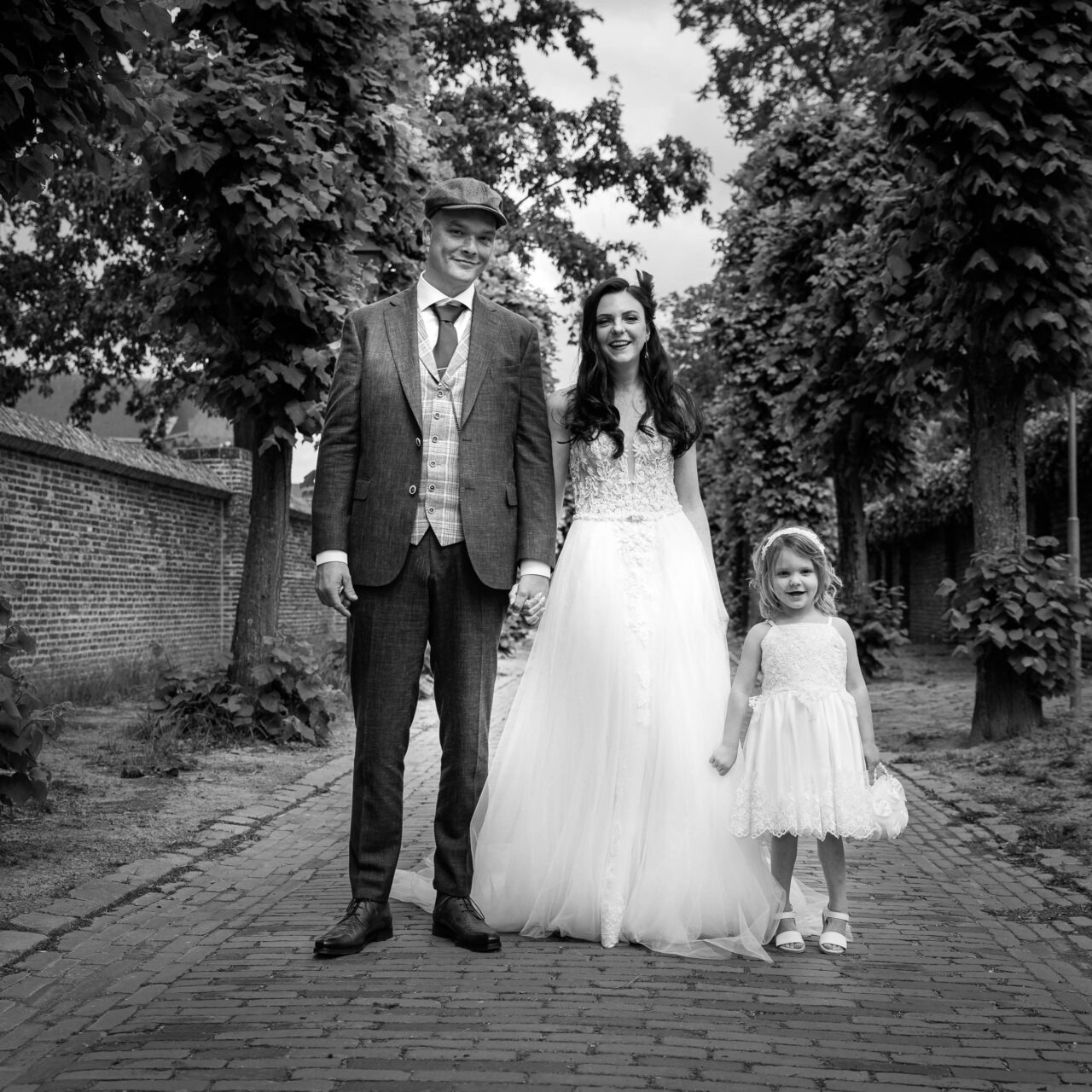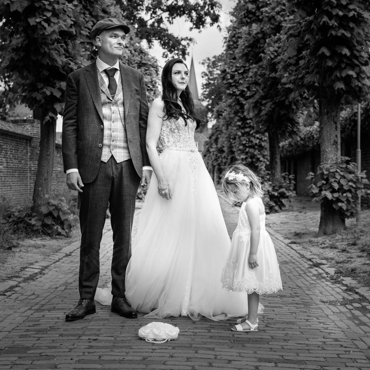 Na de prachtige ontmoeting vertrokken we in de auto voor een fotoshoot bij de Mazijk en achter het kasteel. Daar ontstonden bruidsfoto’s die bijna filmisch aanvoelden: een beetje rauw, zwart-wit, met mooi licht en precies genoeg randje. Maar wel in liefdevol contact. En ruimte voor leuke grapjes van hun dochter.