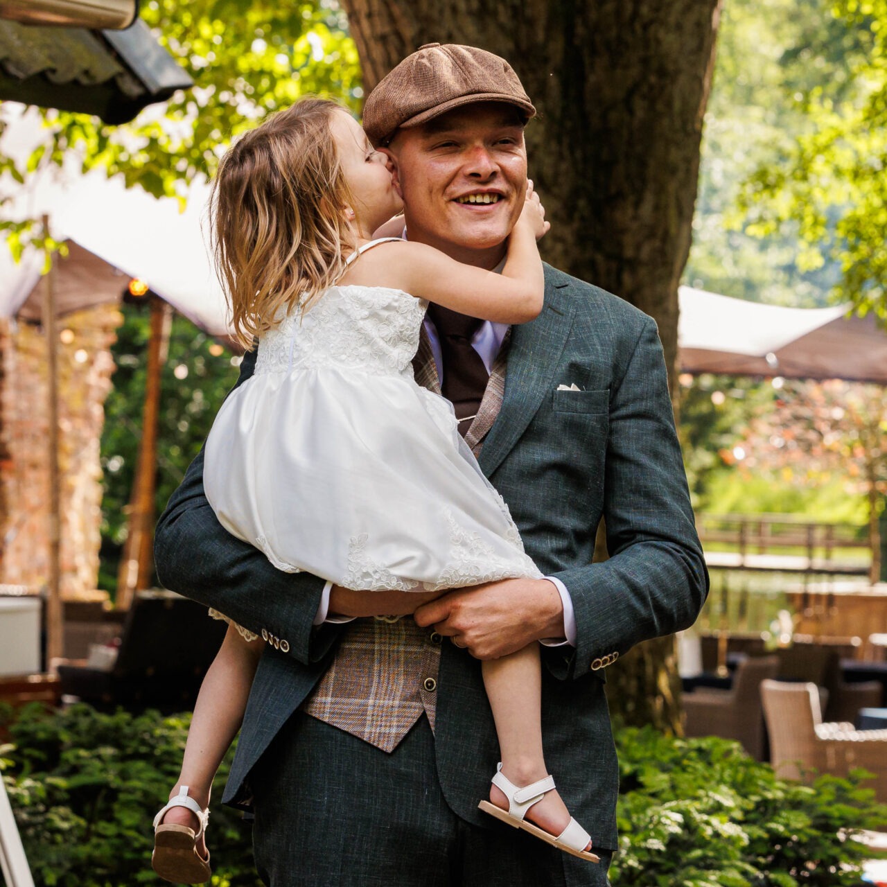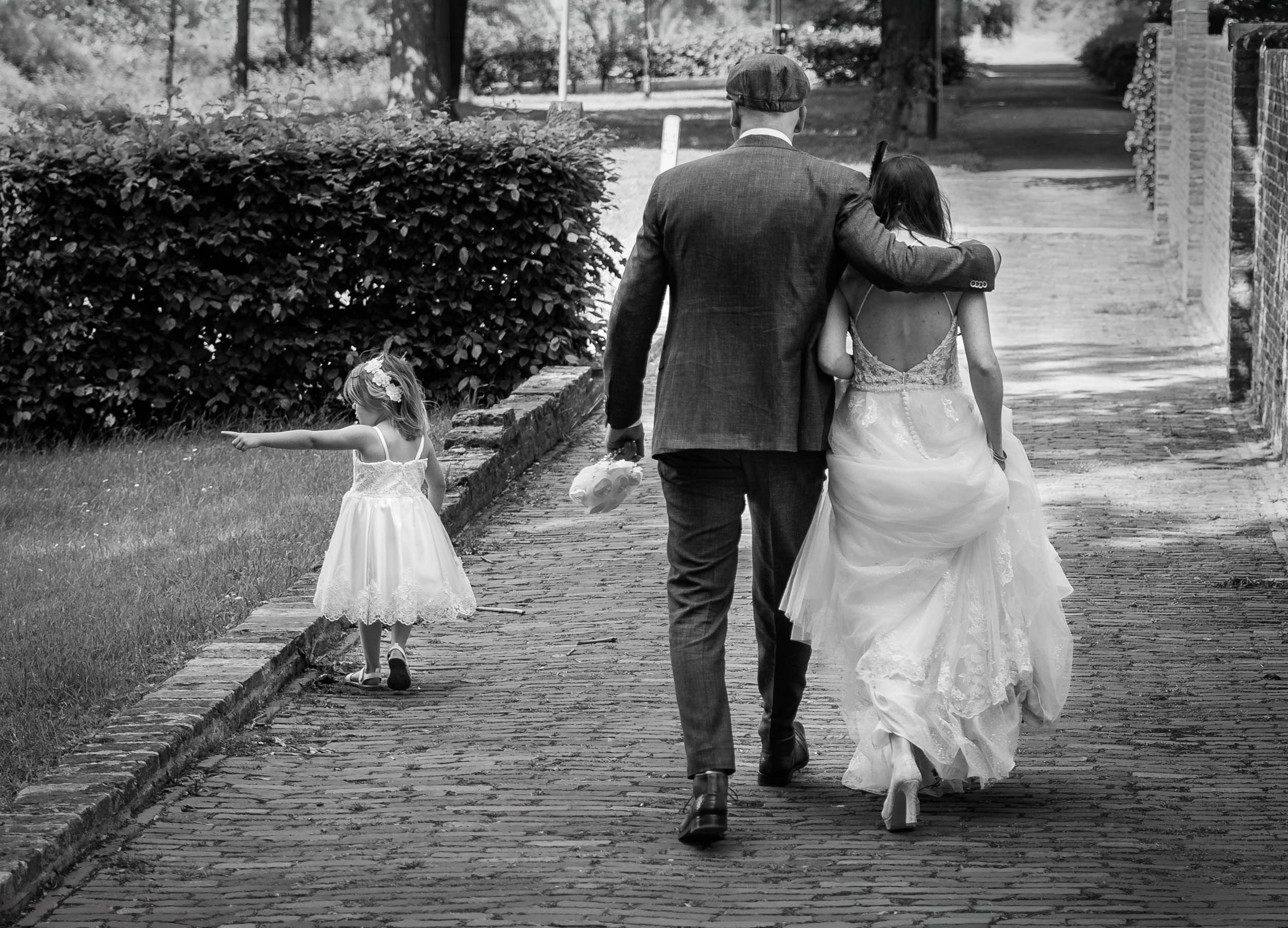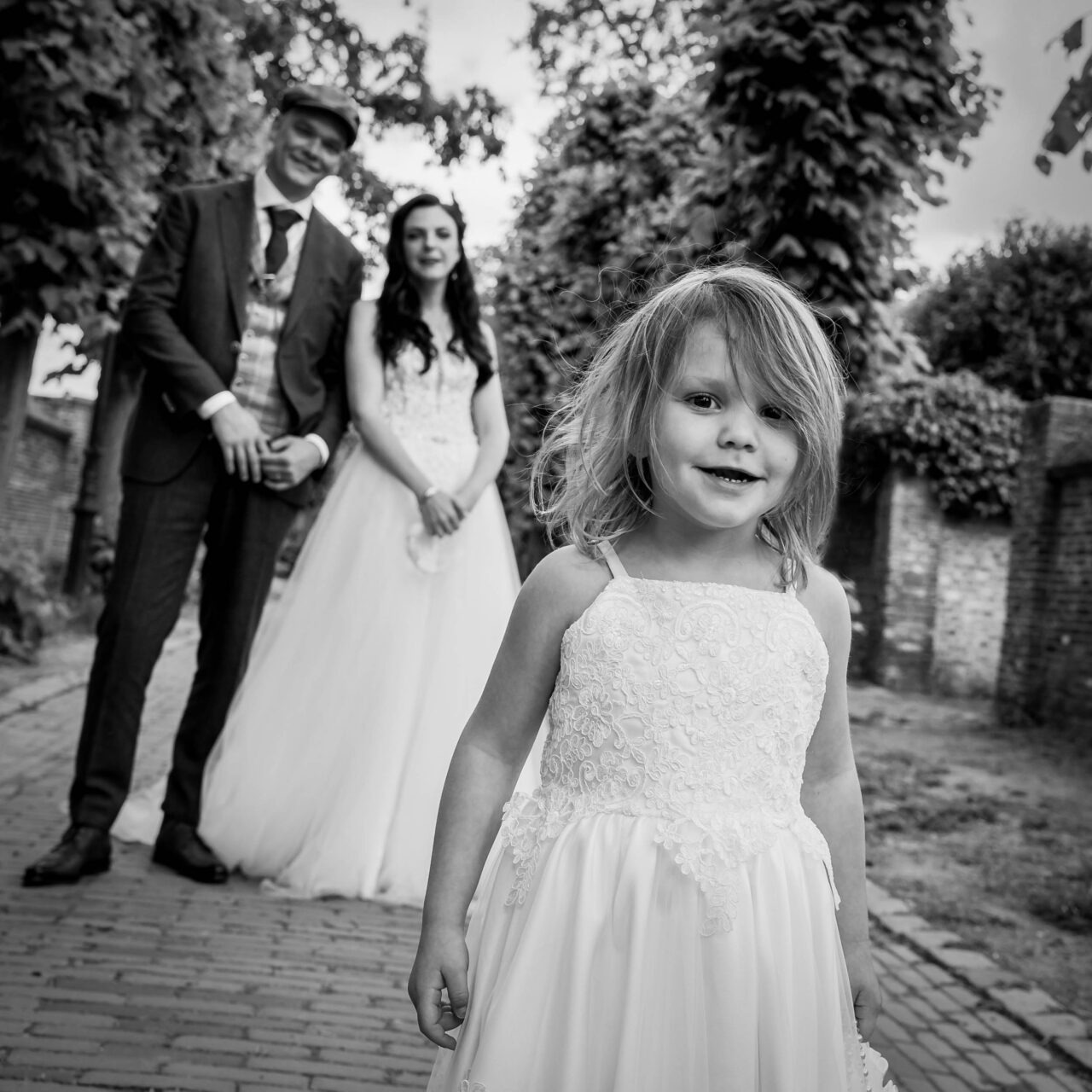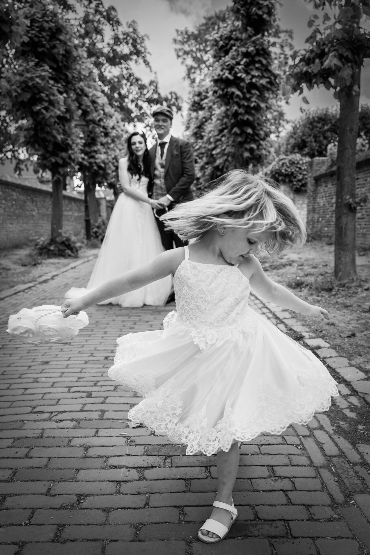 Na de prachtige ontmoeting vertrokken we in de auto voor een fotoshoot bij de Mazijk en achter het kasteel. Daar ontstonden bruidsfoto’s die bijna filmisch aanvoelden: een beetje rauw, zwart-wit, met mooi licht en precies genoeg randje. Maar wel in liefdevol contact. En ruimte voor leuke grapjes van hun dochter.