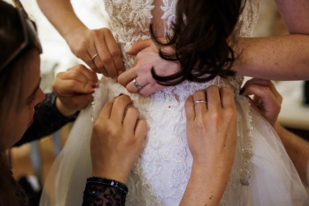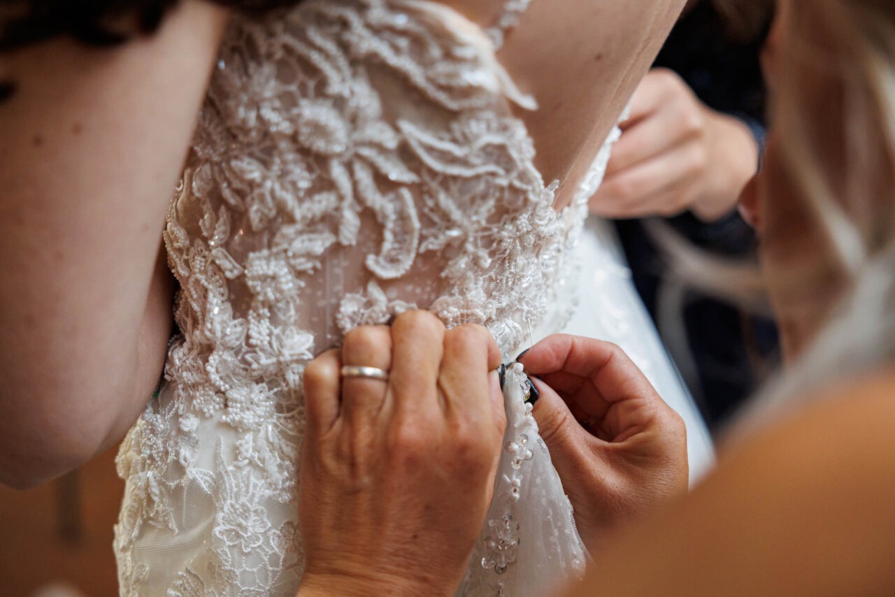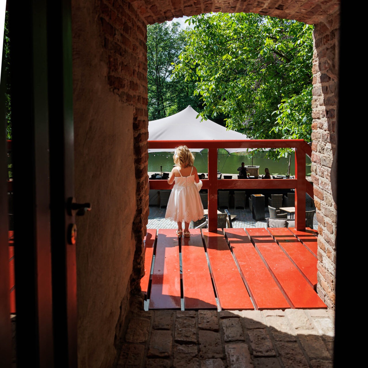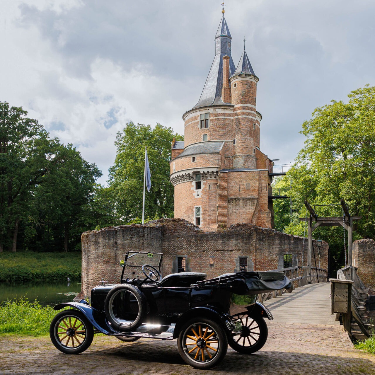 Na de prachtige ontmoeting vertrokken we in de auto voor een fotoshoot bij de Mazijk en achter het kasteel. Daar ontstonden bruidsfoto’s die bijna filmisch aanvoelden: een beetje rauw, zwart-wit, met mooi licht en precies genoeg randje. Maar wel in liefdevol contact. En ruimte voor leuke grapjes van hun dochter.