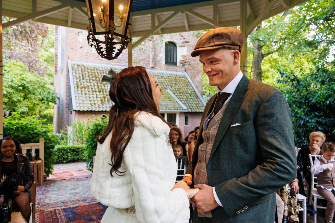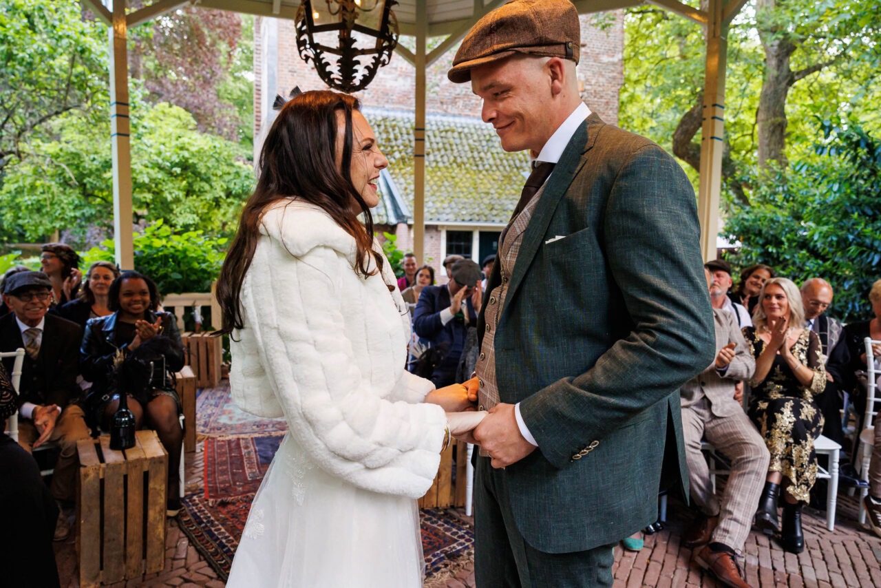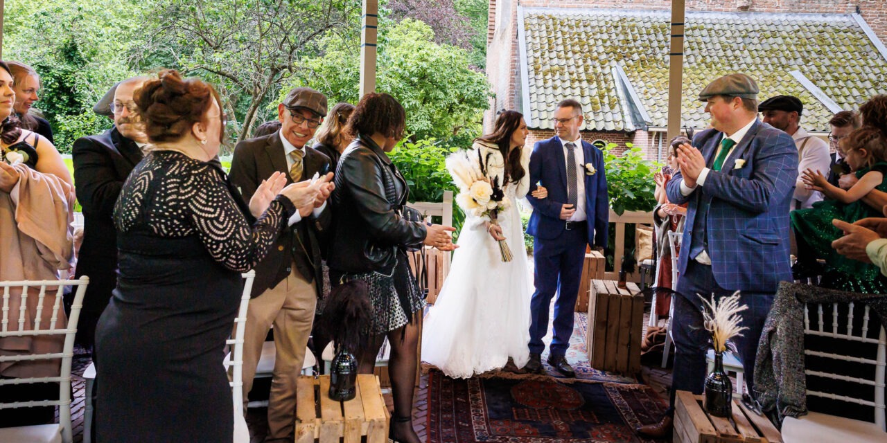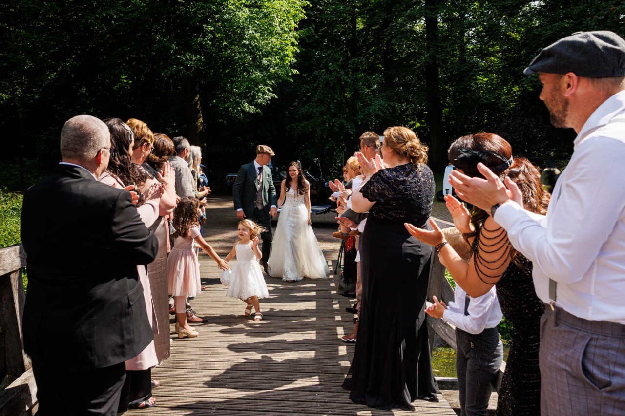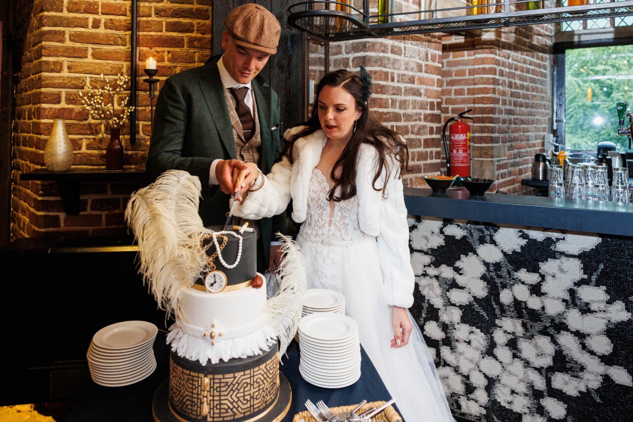 Wat het extra bijzonder maakte: bij de ontvangst van het bruidspaar bleek dat alle gasten goed hun best hadden gedaan op hun outfit. Gasten verschenen in jaren ’20 stijl, waardoor je bijna het gevoel had samen even in een andere tijd te leven. Voor mij als bruidsfotograaf superleuk!