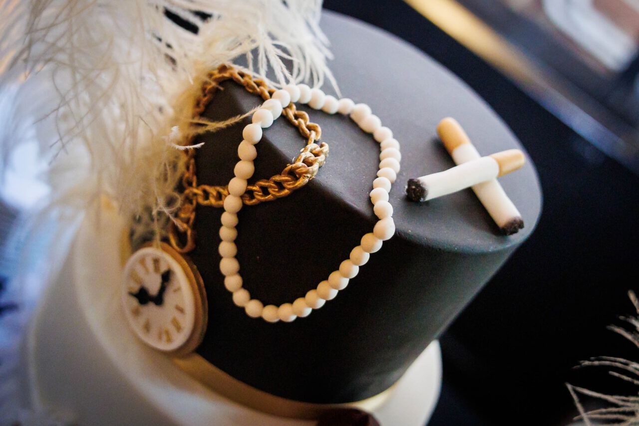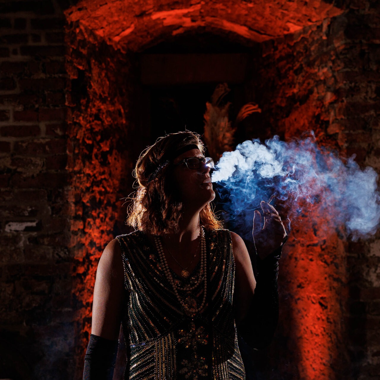 Later op de dag werd het spel met licht en sfeer nog sterker. Rokende gasten, ik plaatste flitsers van achteren, beelden met die typische, bijna mysterieuze uitstraling. En als afsluiter een taart in dezelfde stijl: stoer, donker en helemaal passend, gemaakt door Welovecakes.